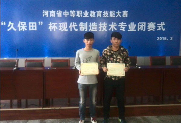 3月28日,在刚刚结束的由河南省教育厅主办的河南省中等职业教育技能大赛中传来喜讯:我院机械工程系机加1301班学生岳志豪、范泽坤,在“久保田”杯现代制造技术专业车工组比赛80余名选手中脱颖而出,双双获得一等奖。王俊卿、陈稳堂两位辅导老师获“优秀辅导教师”称号。