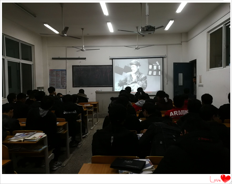 在放映过程中,同学们认真的观看。观看结束后,各班级同学进行讨论,每班推荐了一条关于“雷锋精神”的名言警句。如17五年制机器人一班的标语是——雷锋精神传天下,互助暖流漾人心。