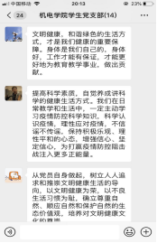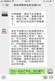 机电工程学院教工党支部于2020年3月8日在支部微信群中召开会议,开展主题党日活动。会议由支部书记王俊卿同志主持。本次党日活动通过观看优秀党员教育片等方式开展,宣传他们在疫情防控工作中主动作为、做表率的感人事迹。此次党日活动确保了疫情期间党员学习不冷场、不断线,有效推动党建与疫情防控工作深度融合,更好地发挥党支部的战斗堡垒作用和党员的先锋模范作用。