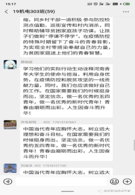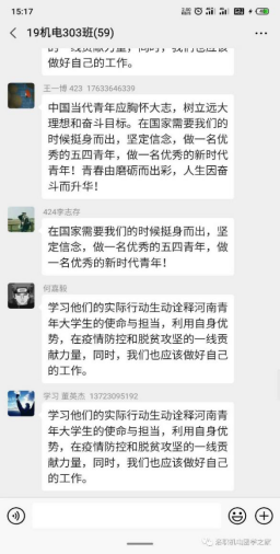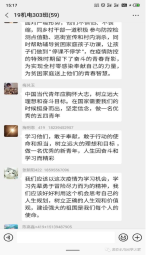 同学们在各班团支书的带领下,通过对马明杰等10位大学生先进事迹的学习,用实际行动来阐述当代青年大学生的使命与担当,虽是线上学习,但团课期间同学们的积极性很高,认真讨论问题,纷纷发表出自己对青春与中国青年使命的理解和做法。