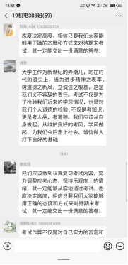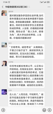 团课开始后,各班团支书将有关诚信考试的视频资料发送到班级群里,在阅读观看之后,同学们在各班团支书的带领下,认真讨论团课主题,纷纷发表对诚信考试的理解和看法。19级物联网302班朱岗说:“懂得诚实守信是中华民族的传统美德,在现代社会同样需要诚实守信,我要做一个诚信的大学生,努力做到说话做事诚实守信,表里如一,诚信考试,做文明考生。”