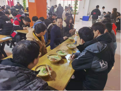 韩洪涛利用午饭时间,在高新校区餐厅与同学们共同午餐,亲切交流。从中国传统文化的视角为同学们解读了我校校训的含义,“学以致用,行以致远”,要有远大的理想,高尚的情操,不仅要有专业技术,更重要的是要培养自身较高的文化素质。韩洪涛叮嘱同学们要知行合一,理论联系实际,才能更好的走向社会,走向世界,为把我院打造成一个综合性、开放性、国际化、现代化的职业大学而共同努力。韩洪涛表示,学校开展领导干部联系学生工作以来,作为20级机电303班、19级大专汽检302班的联系人,一直关注着同学们的发展,希望同学们利用好大学三年的学习机会,学会管理时间、用好时间,积累更多的知识,向更高的学业层次冲击。他勉励大家要通过自己的努力,团结集体的力量,争取取得更好的发展,并祝愿同学们学习进步、身心健康。