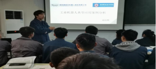 围绕洛阳市装备制造产业智能化发展的需求,助力洛阳中原城市群副中心城市建设,结合洛阳市“9+2”工作布局、“565”现代产业体系建设要求,我院于2016年开设了工业机器人技术专业,该专业是培养从事工业机器人工作站的应用、维护、方案设计、系统集成、技术销售等工作的高素质技术技能型人才的专业。专业开办后,我院荣获河南省第三批工业机器人操作与运维及工业机器人集成应用 “1+X”证书制度试点单位。我院与洛阳美锐克机器人科技有限公司(河南省高新技术企业)共建工业机器人集成应用校内生产性实训基地。