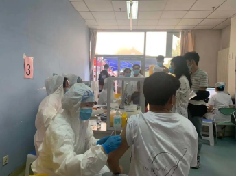 青年志愿者协会志愿者参与接种服务,与医护人员疫起同行,一心奉献。
