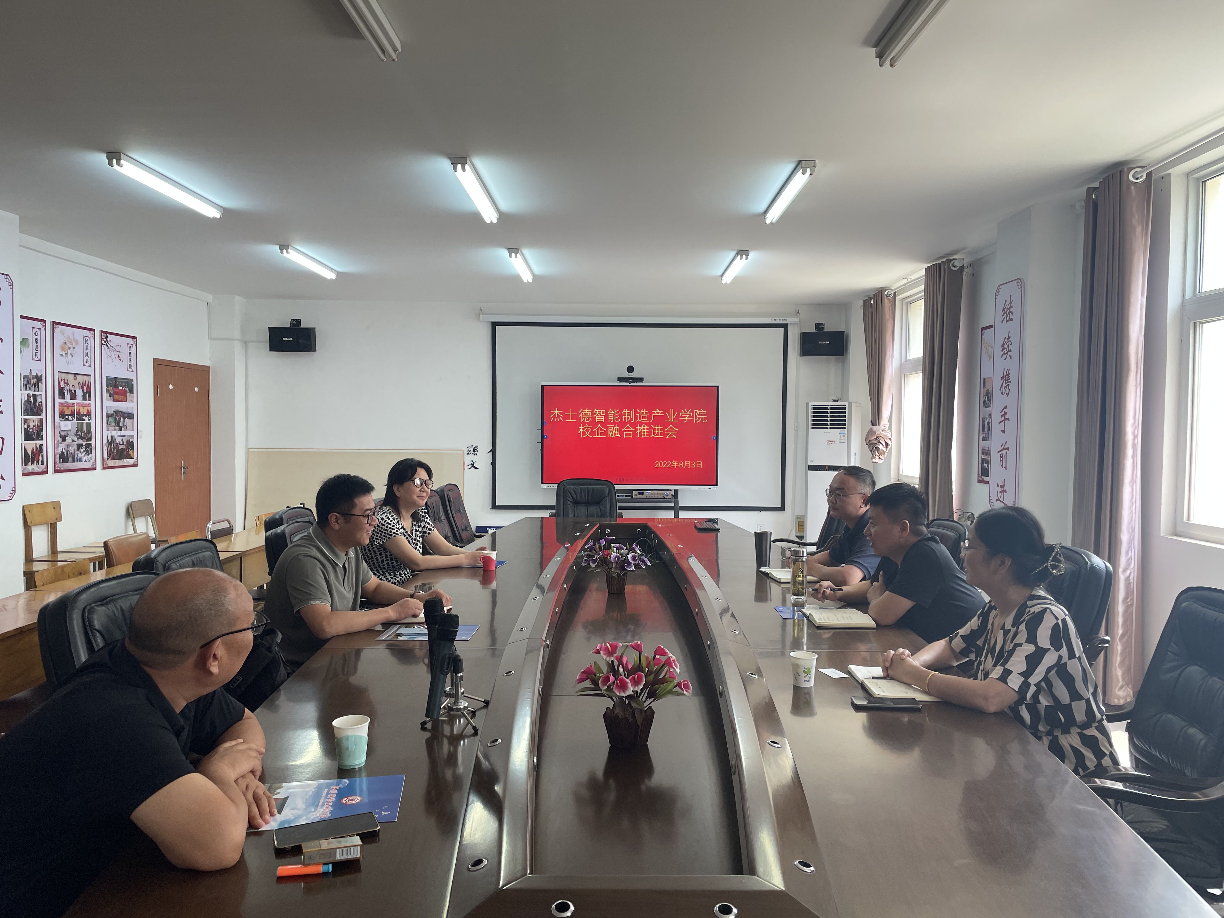 8月3日上午,我院与江苏杰士德精密工业有限公司一行在综合楼304会议室举行杰士德智能制造产业学院校企融合推进会,就共建产业学院、培养智能制造专业技术人才等事宜进行洽谈交流。机电工程学院院长张春伟、副书记马玲娟、副院长李铁参加会议。