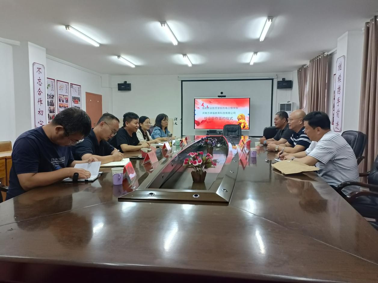 8月22日下午,我院与河南万德福教育科技有限公司在综合楼304会议室成功举行校企合作签约仪式,就共建高技能人才培养实训基地达成合作意向。机电工程学院院长张春伟、副书记马玲娟、副院长李铁、综合办主任王春艳、无人机教研室主任温同强参加会议。