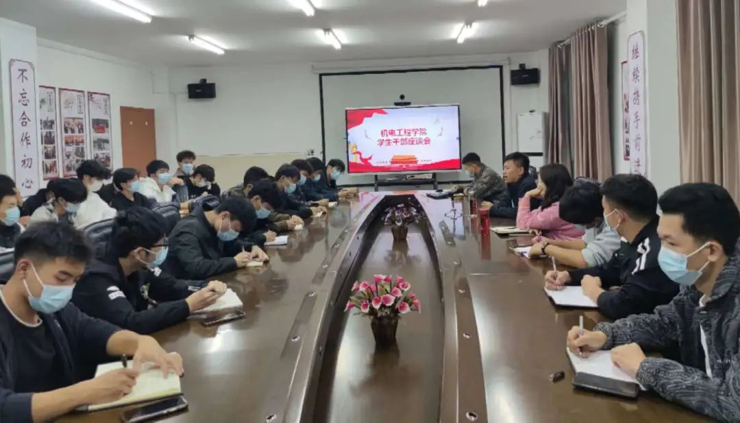 为进一步做好学院疫情防控工作,提升学生干部的理论素养和工作能力。机电工程学院于11月9日在综合楼三楼会议室召开了学生干部座谈会。本次座谈会由学工办主任段檀烁主持,机电工程学院院长张春伟出席,各班学生干部参加。
