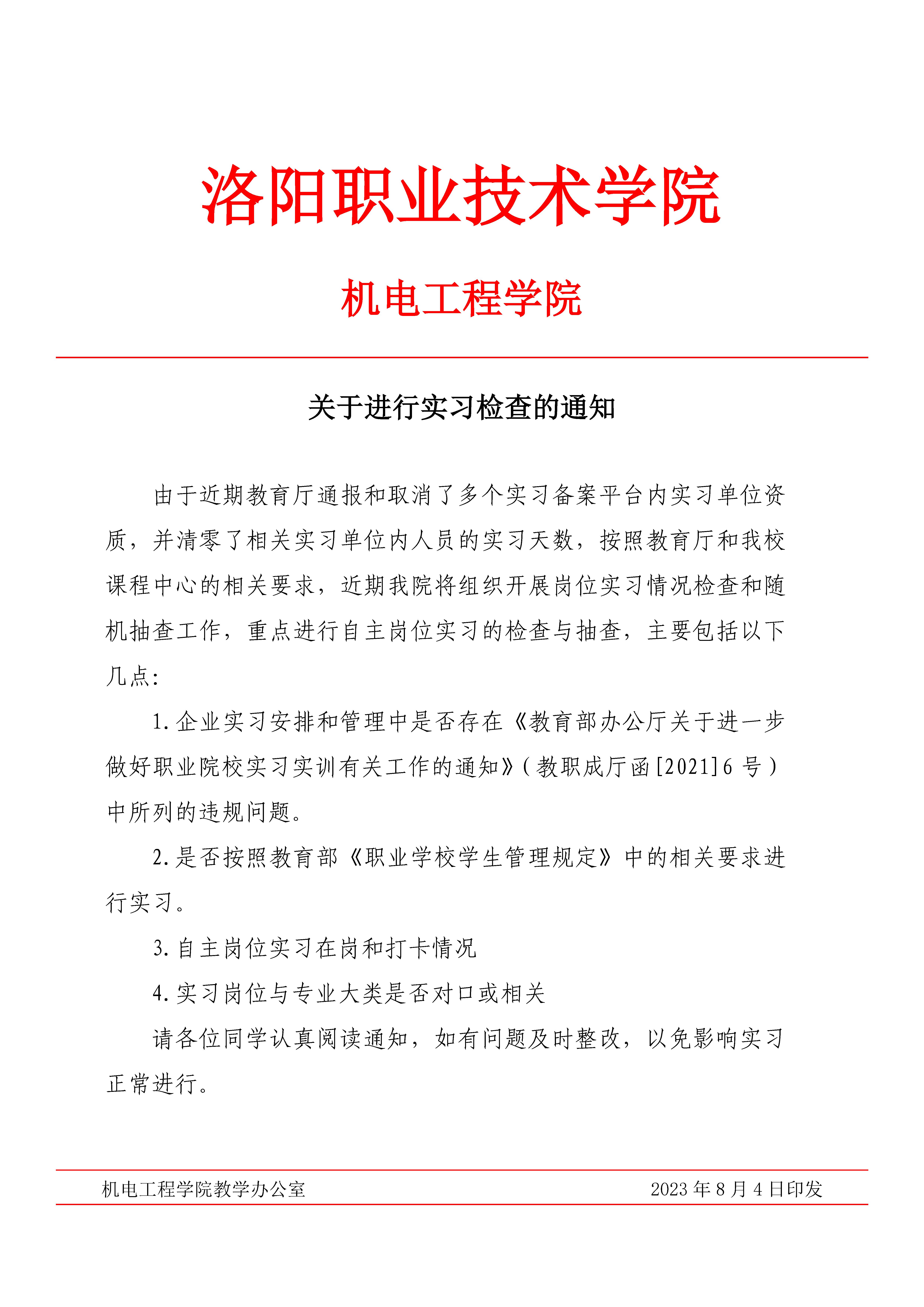 机电工程学院关于进行实习检查的通知