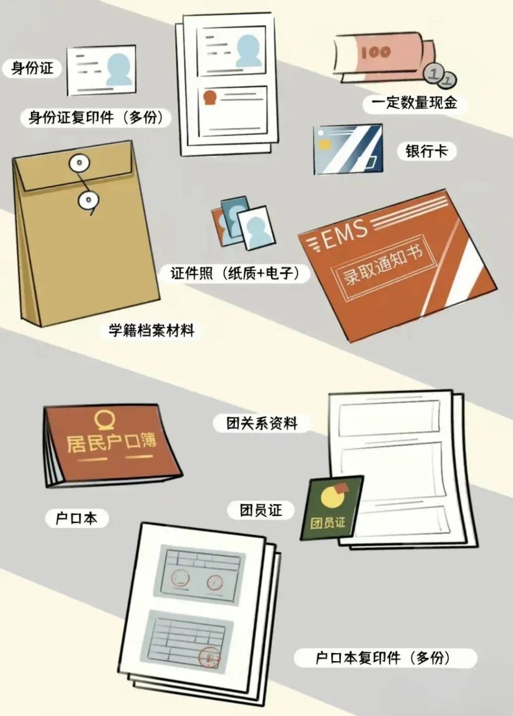 以上为大家归纳总结的清单除了必带的证件材料,剩下的大家可以根据需求自己提前准备或者到学校后再购买。