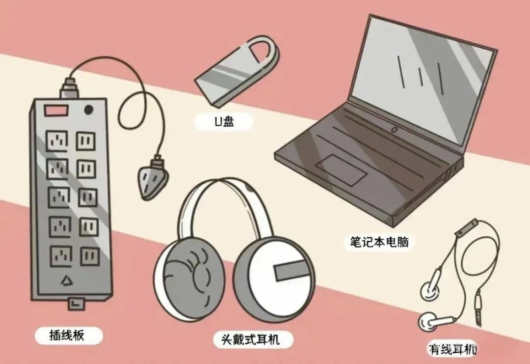 U盘、笔记本电脑(处理文件更为快捷方便)、充电宝、键盘、耳机。