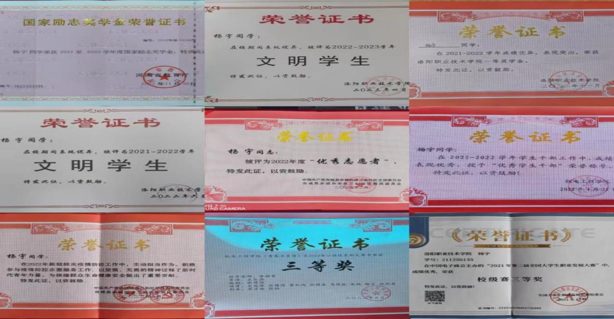 “随风潜入夜,润物细无声。”作为新时代的大学生,他深知除了自己扎实苦干,更应潜移默化地引领和服务他人,与同学们共同成长。在担任班长兼团支部副书记期间,他坚持严谨的工作态度,始终以自身思悟引领支部团员,详细记录每一次支部活动的出勤情况。曾获得洛阳职业技术学院优秀学生干部、洛阳职业技术学院文明学生、洛阳职业技术学院优秀共青团干部等多项荣誉称号。