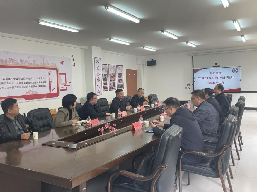 3月21日下午,宝鸡职业技术学院院长张永良、校企合作处处长马博、机电信息学院院长王核心、校企合作科科长杨少龙一行到我院考察交流,机电工程学院院长张春伟等人陪同调研。