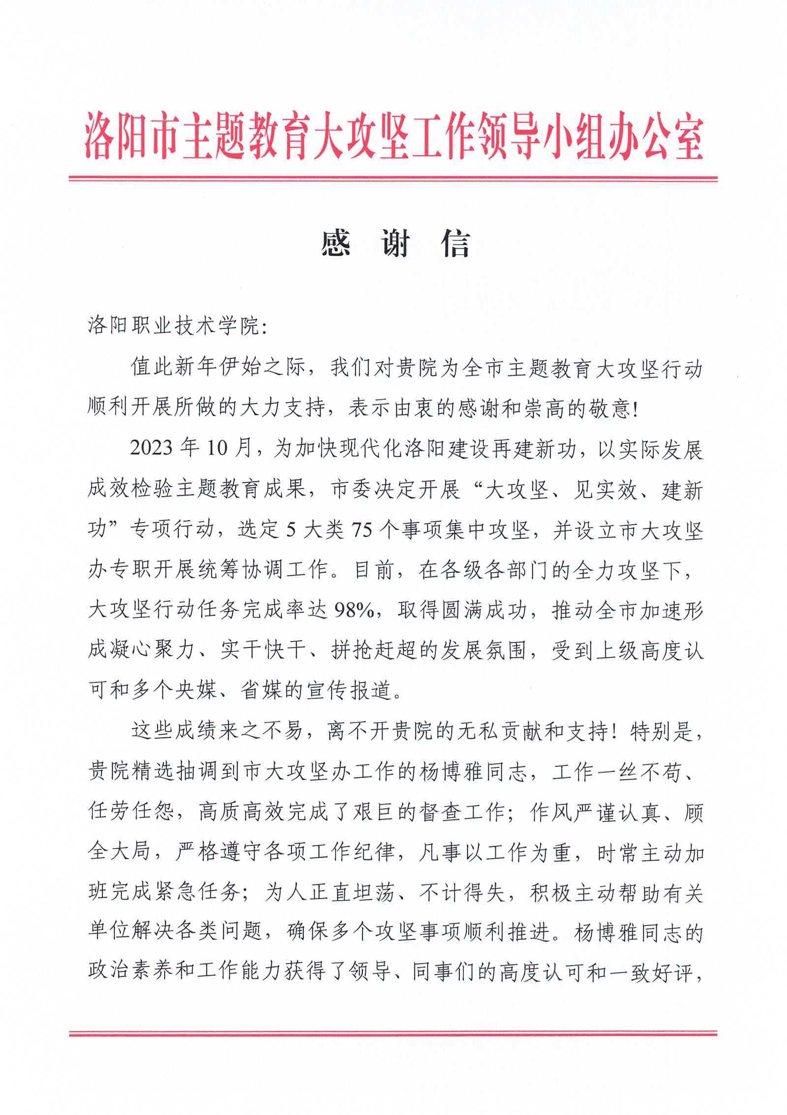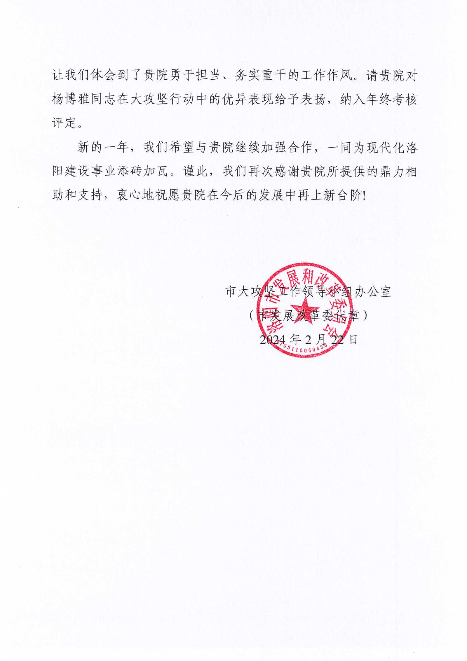 洛阳市主题教育大攻坚办公室对我院抽调杨博雅同志支持大攻坚行动表示感谢,对杨博雅同志的工作态度及工作能力和该同志展现出的我院勇于担当、务实重干的工作作风表示高度认可和赞赏。