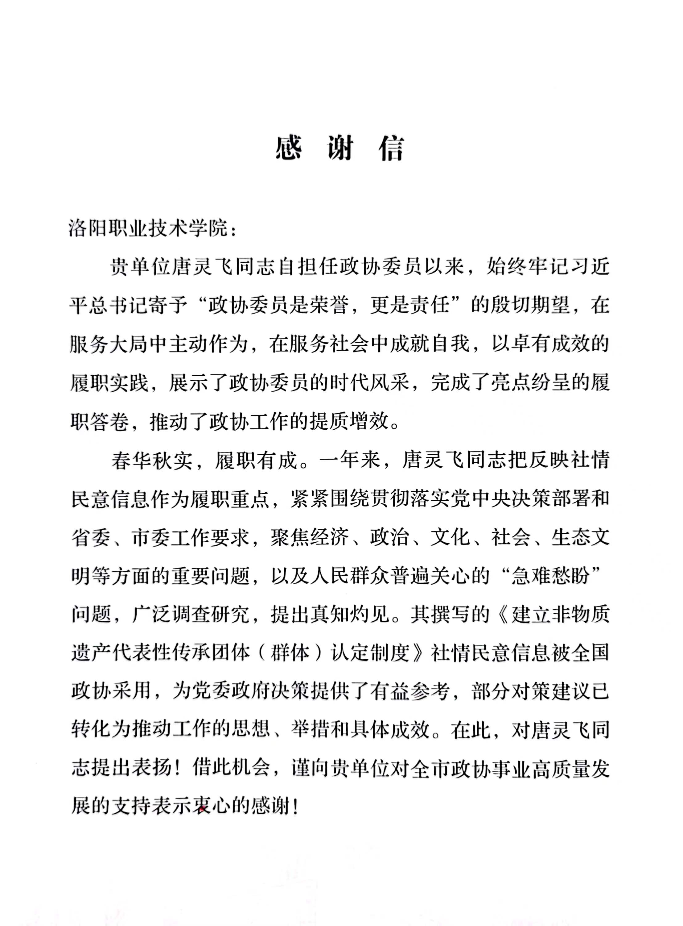 洛阳市政协办公室对我院政协委员唐灵飞积极建言献策表示感谢,唐灵飞担任政协委员期间,广泛调查研究,反映社情民意,该同志撰写的《建立非物质遗产代表性传承团体(群体)认定制度》已被全国政协采用,为党委政府决策提供了有益参考。