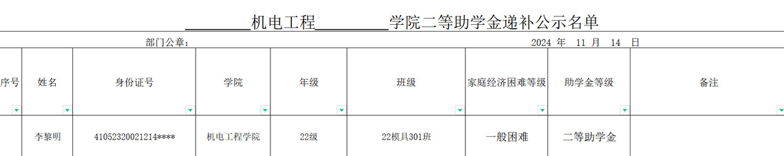 根据《洛阳职业技术学院国家助学金评审实施办法》,经学院核查,21机电501班吴天毅不符合评选要求,经学院研究,现取消该生二等助学金资格,并在学院内重新评选,经班级、学院民主评议、各阶段公示,现将递补二等助学金的学生情况公示如下,请大家监督。