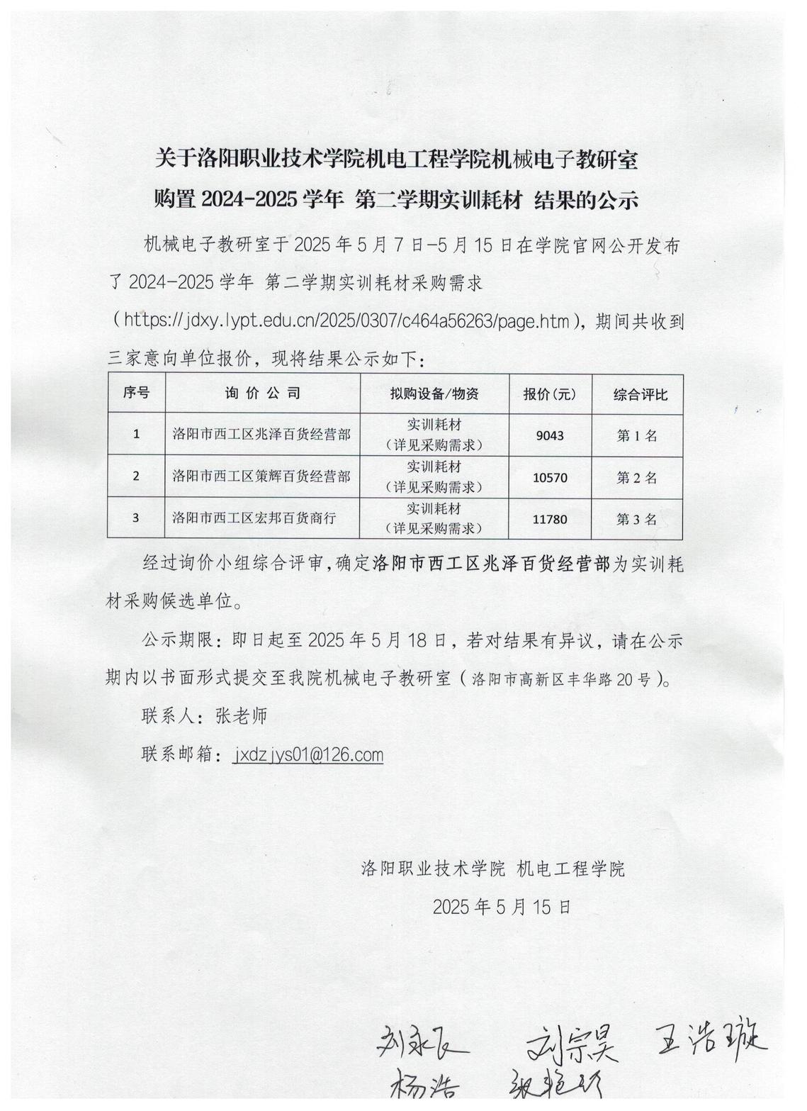 机械电子教研室 购置2024-2025学年 第二学期实训耗材 结果的公示