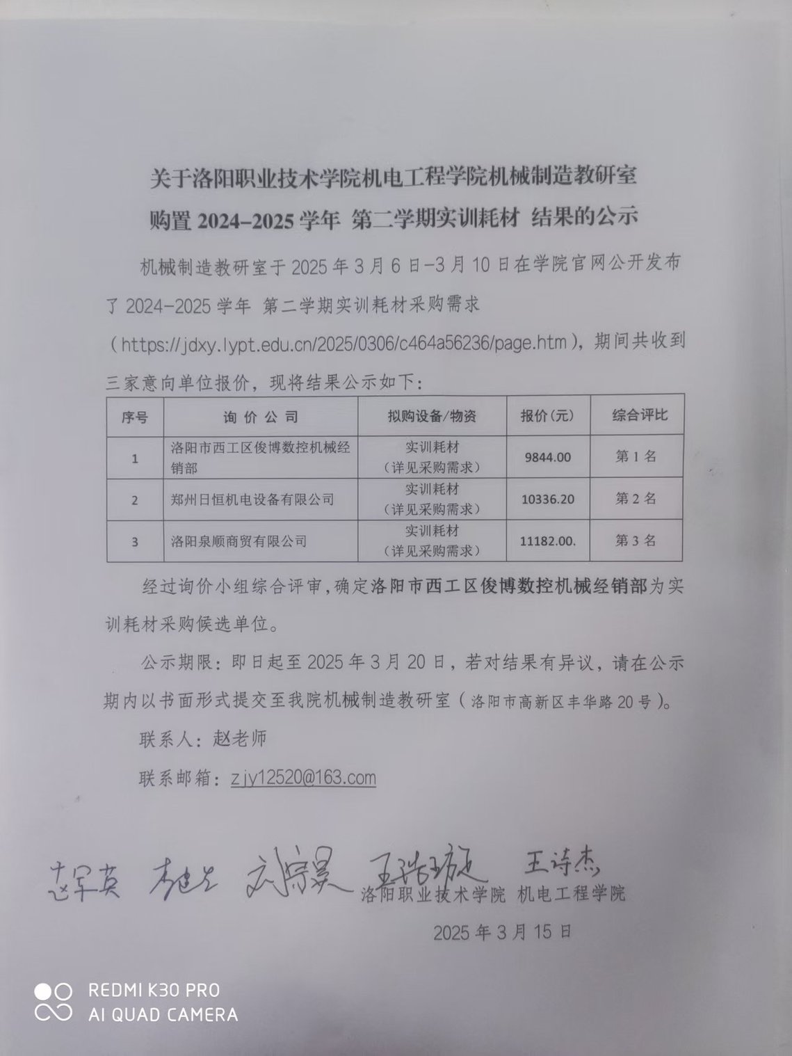 机械制造教研室 购置2024-2025学年 第二学期实训耗材 结果的公示