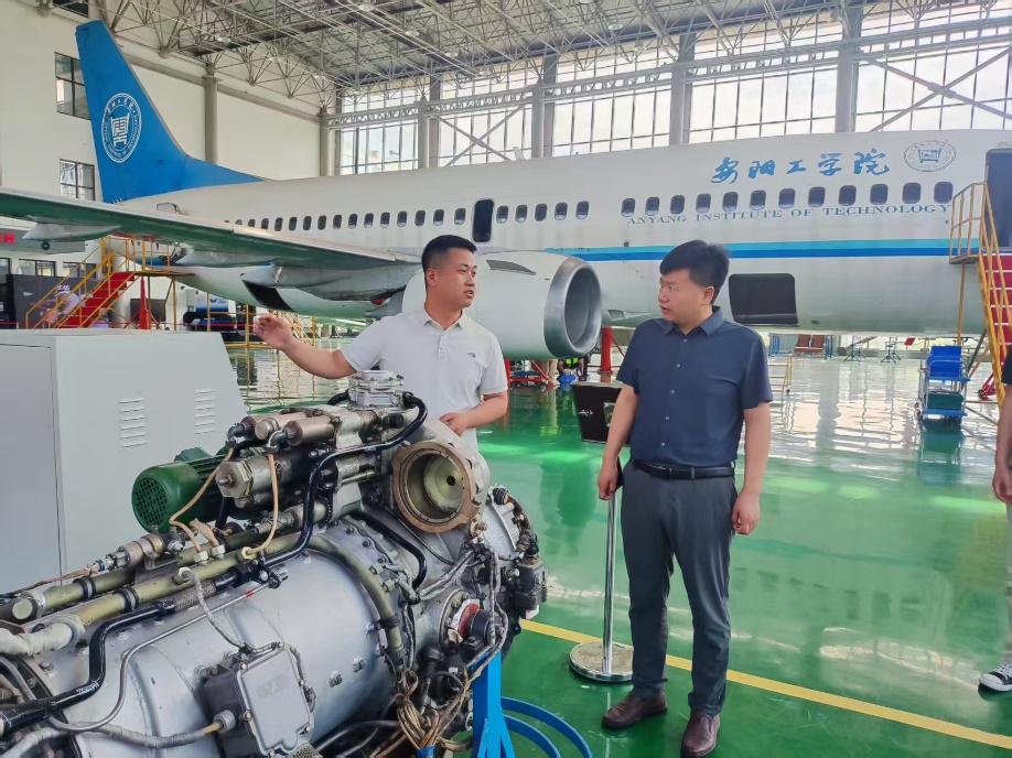 当日上午,调研组首站抵达全国 9 所航空特色高校之一的安阳工学院。该校 “飞行器制造工程” 专业为国家一流专业,张春伟一行实地走访机械与航空制造工程学院、电子电气与无人机学院等,深入了解学科发展脉络、特色专业建设及实训室运营情况,对其在航空与低空经济领域的办学成就给予高度评价。