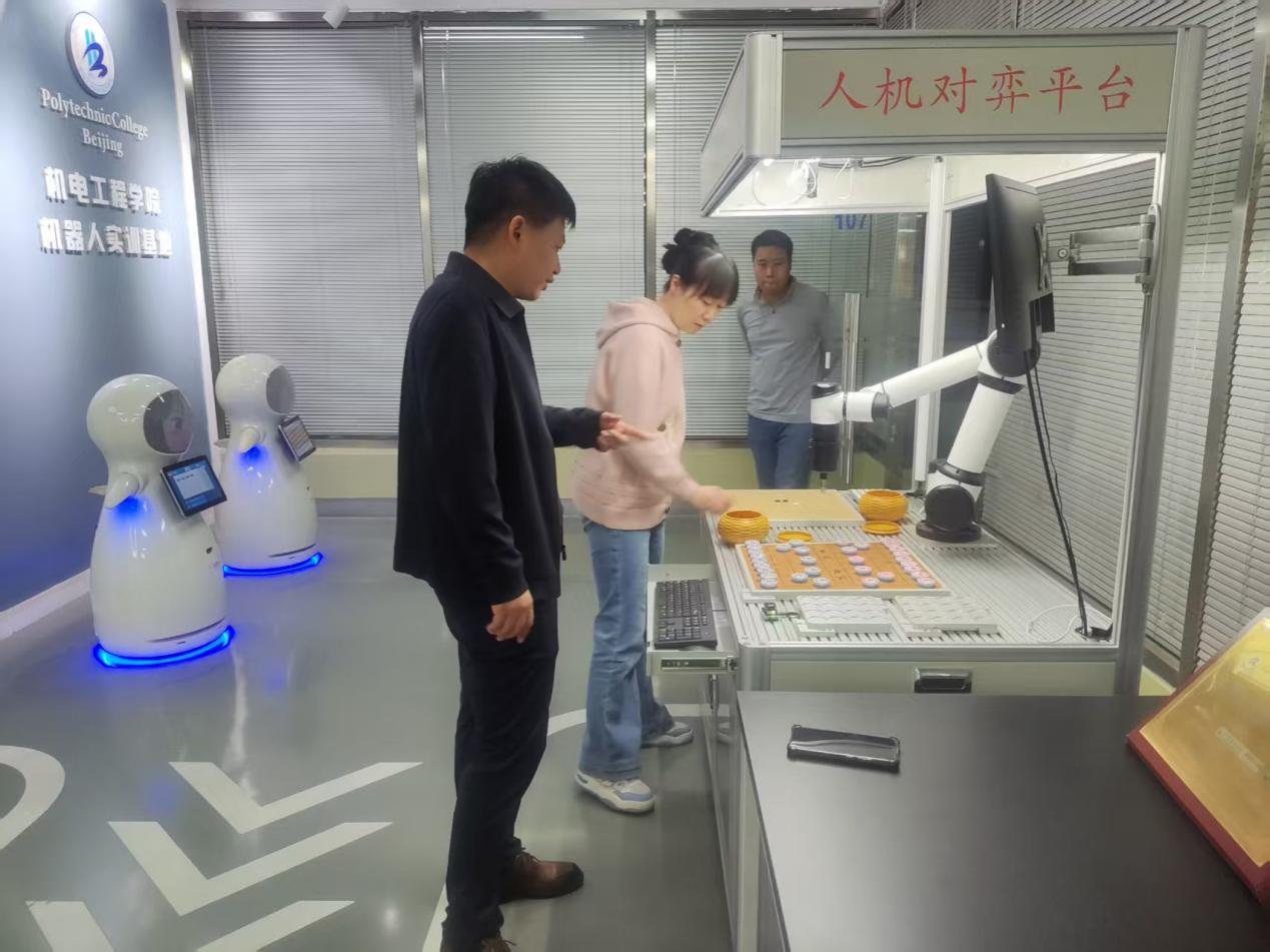 随后,张春伟一行前往北京工业职业技术学院机电工程学院,与院长张春芝就学院发展规划、校企协同共建、教科研研究、学生就业质量提升等多方面进行了深入探讨,并参观了学院相关专业实训室。
