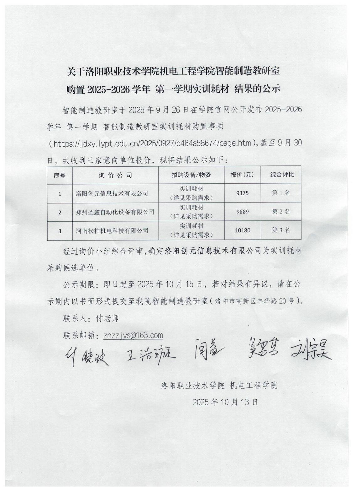 智能制造教研室购置2025-2026学年第一学期实训耗材结果的公示